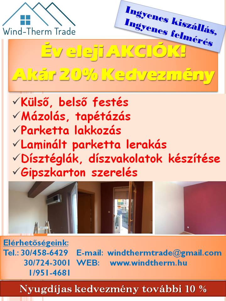 Akár 20% Kedvezmény: külső, belső festés, mázolás, tapétázás, parketta lakkozás, laminált parketta lerakás, dísztéglák, díszvakolatok készítése, gipszkarton szerelés